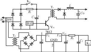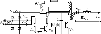 該電路如圖3所示。在電源瞬時接通時,輸入電壓經整流橋VD1VD4和限流電阻R對電容器C充電。當電容器C充電到約80%的額定電壓時,逆變器正常工作,經主變壓器輔助繞組產生晶閘管的觸發信號,使晶閘管導通并短路限流電阻R,開關電源處于正常運行狀態。