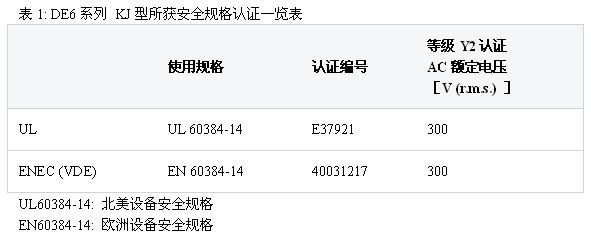 要想獲得安全規(guī)格認(rèn)證,需要接受規(guī)定的實(shí)驗(yàn)并滿足要求標(biāo)準(zhǔn),通過(guò)合格判定,才能夠證明電容器符合該規(guī)格。但目前,對(duì)On-Board(含車載充電器的車載設(shè)備)的安全規(guī)格并無(wú)明確規(guī)定。實(shí)際上,車載充電器已經(jīng)參照現(xiàn)有民用設(shè)備的安全規(guī)格,決定了其規(guī)格發(fā)展方向并付諸實(shí)施。因此,該電容器在遵循現(xiàn)有的設(shè)備安全規(guī)格(IEC 60384-4)的基礎(chǔ)上,也獲得了各國(guó)的安全規(guī)格認(rèn)證。DE6系列“KJ”型所獲得的安全規(guī)格認(rèn)證如下表1所示。