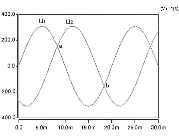 在一個周期內,u1和u2存在兩個交點,即a,b兩點。a點是u2>u1的起始點,b點是u1>u2的起始點,該設計對a點進行檢測,通過電路變換,在每一個周期的a時刻產生相應的脈沖信號,并將該信號送至單片機的外部中斷,單片機對中斷進行處理和判斷,從而檢測到自然換相點,同時通過軟件對三相電源的頻率、相序以及是否缺相作出判斷。
