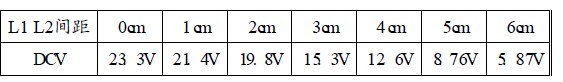 在接收單元空載(不接被充電池)情況下,保持L1與L2同軸,改變L1-L2間距,測量接收單元C5兩端電壓DCV。