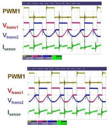 圖2所示為一個(gè)雙相交錯(cuò)式雙開(kāi)關(guān)正向轉(zhuǎn)換器的實(shí)驗(yàn)波形,本例采用ADI公司的數(shù)字控制器ADP1043實(shí)施控制。當(dāng)總負(fù)載電流降至某一閾值以下時(shí),第二相位禁用。如圖3所示,當(dāng)一個(gè)相位關(guān)斷時(shí),輕載效率得到提高。實(shí)施和不實(shí)施相位優(yōu)化控制的輕載效率差可能高達(dá)15%。
