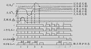如工作電壓超出其欠壓設(shè)定值時,吸合工作觸點進入所設(shè)定的延時保護狀態(tài)(設(shè)定時間為0~30s)。待延時結(jié)束后,控制器工作觸點釋放,由接通狀態(tài)變至斷開狀態(tài),直至電壓重新回至正常電壓工作帶。在工作時序圖中,保護觸點狀態(tài)2、3即為欠壓保護工作狀態(tài)。