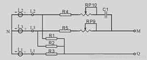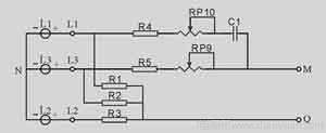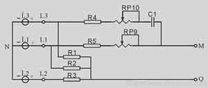 在保護器電壓處于正常工作帶時,且工作電源端所加電壓相序(L1、L2、L3)為正相序,工作保護觸點吸合。如L1電壓呈斷相狀態(tài)時,則其余兩相呈過壓狀態(tài),保護器也隨之進入保護狀態(tài)。當L1相又重新恢復供電,且加入電壓的L1、L2、L3都在其規(guī)定的正常工作帶范圍內(nèi)時,保護觸點6又重新開始吸合工作。當加入工作電源輸入端由L1、L2、L3變?yōu)長2、L1、L3或L3、L2、L1時,因相序發(fā)生變化,保護器的保護觸點都呈釋放斷開狀態(tài),無保護功能。