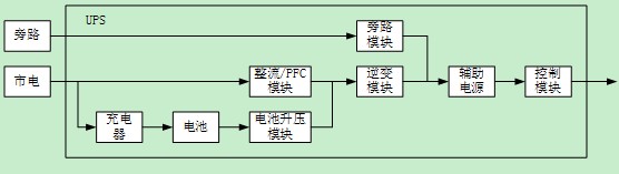 從單個(gè)UPS的設(shè)計(jì)來(lái)說(shuō),可以把整個(gè)產(chǎn)品按照模塊進(jìn)行劃分,下面圖中是一個(gè)典型的UPS系統(tǒng)結(jié)構(gòu)圖