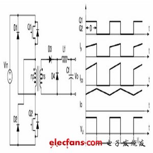 雙管正激變換器的原理圖與波形如圖1所示。雙管正激變換器的工作可以分為三個(gè)過程:能量轉(zhuǎn)移階段、變壓器磁復(fù)位階段和死區(qū)階段。在能量轉(zhuǎn)移階段,原邊的兩個(gè)開關(guān)都導(dǎo)通,能量從輸入端向輸出端轉(zhuǎn)移。在變壓器磁復(fù)位階段,原邊的兩個(gè)二極管都導(dǎo)通,使變壓器繞組承受反相輸入電壓,從而實(shí)現(xiàn)變壓器磁復(fù)位。當(dāng)變壓器完全復(fù)位后,變換器工作在死區(qū)階段,即原邊無電流、副邊續(xù)流。在復(fù)位過程中,雙管正激開關(guān)MOSFET被箝位在輸入電壓。MOSFET上的電壓應(yīng)力小于單管正激,至少低一倍。這樣我們可選取具有低導(dǎo)通電阻Rdson的低電壓MOSFET,以獲得低損耗。
