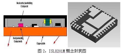 Intersil的ISL8201M模塊集成了一個完整的DC/DC轉換器所需的大多數組件,包括PWM控制器、MOSFET和電感器。其輸入電壓范圍為3-20V,電流能力為10A。它可實現比傳統 SIP DC/DC模塊高得多的開關頻率,通過不使用MOSFET封裝并將這些組件共同封裝在一個緊湊的15×15×3.5mm的QFN封裝中(見圖2),實現了極佳的效率和熱性能。ISL8201M是一個系列模塊中的第一個產品,尺寸和性能的進一步改善正在開發當中。