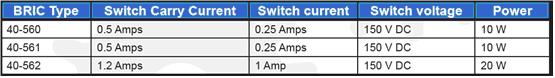 下表中所示的是BRIC模塊中不同的開關類型的不同額定值