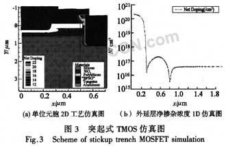 通過圖1中傳統(tǒng)TMOS的截面圖和突起式溝槽工藝截面圖的比較,可以看到傳統(tǒng)的工藝是利用光刻工藝以掩模版形成器件源區(qū)(n+),但是當(dāng)尺寸不斷縮小以后,源區(qū)掩模版形成的光刻膠尺寸隨之變小,在后續(xù)的離子注入工藝中,增加了光刻膠脫落的風(fēng)險(xiǎn),這就意味著單位元胞中本該被光刻膠掩蔽的有源區(qū)會(huì)被注入As+離子,從而產(chǎn)生寄生的npn三極管,導(dǎo)致器件工作時(shí)漏電增加,嚴(yán)重情況下會(huì)導(dǎo)致器件完全失效。本文采用溝槽式接觸這一概念,當(dāng)源區(qū)注入時(shí),有源區(qū)不保留光刻膠,As+離子完全注入,之后利用接觸孔掩模版直接刻蝕掉多余的As+離子注入?yún)^(qū)域,完全避免了傳統(tǒng)工藝下產(chǎn)生寄生npn三極管的風(fēng)險(xiǎn),如圖1(b)中新型TMOS結(jié)構(gòu)所示。