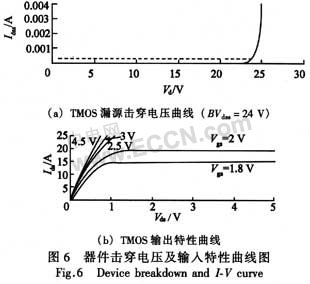 為了驗(yàn)證這一理論,特別設(shè)計(jì)了在傳統(tǒng)工藝下,柵極頂部到外延層表面的多晶硅去除量(130 nm/230 nm/310 nm)的試驗(yàn)。通過器件的電性能參數(shù)比較,如圖4(a)所示,可以看到,隨著多晶硅去除量的增加,閾值開啟電壓隨之降低,說明了器件溝道有效長度變短,源區(qū)離子通過側(cè)壁注入到溝道中,源區(qū)結(jié)深在溝道表面變深。同時(shí)由圖4(b)可知,漏源間漏電流也有明顯的區(qū)別,當(dāng)多晶硅去除量在310 nm時(shí),從累積概率圖中可以看到有部分區(qū)域漏電流增大,這一現(xiàn)象隨著多晶硅去除量的減少而逐步消失,從而驗(yàn)證了溝道有效長度與多晶硅去除量有很強(qiáng)的相關(guān)性。由此可見,為了減少器件性能與刻蝕工藝的相關(guān)性,采用突起式多晶硅技術(shù)是非常必要的。圖5是采用透射電子顯微鏡所得到的突起式TMOS實(shí)際截面圖。可以看到在該圖中的突起式多晶硅結(jié)構(gòu)以及溝槽式接觸,單位元胞相鄰間距為1.4μm的n型TMOS,單個(gè)芯片有源區(qū)面積為0.4 nm2,并采用TSOP6封裝。圖6(a)、(b)分別是器件擊穿電壓曲線以及輸出特性曲線。由圖6(a)可以看到,當(dāng)漏端漏電流為250μA時(shí),擊穿電壓為24 V,滿足大于20 V的設(shè)計(jì)需要,由圖6(b)可以看到,當(dāng)柵極開啟電壓為4.5 v、工作電流為5 A時(shí),對(duì)應(yīng)的導(dǎo)通電阻大致為23.75 mΩ。由于芯片有源區(qū)設(shè)計(jì)尺寸為0.4 mm2,最終Rdson·A為9.5 mΩ·mm2