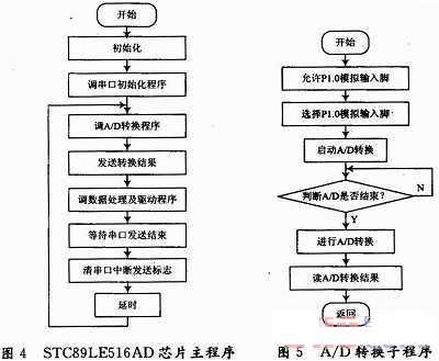 數(shù)據(jù)的采集與處理單元采用自帶A/D轉(zhuǎn)換器的STC89LE516AD單片機芯片,完成數(shù)據(jù)采集、模數(shù)轉(zhuǎn)換、數(shù)據(jù)處理以及驅(qū)動顯示單元。當時鐘在40 MHz以下時,每17個機器周期可完成一次A/D轉(zhuǎn)換。STC89LE516AD單片機與差動脈沖寬度調(diào)制集成電路結(jié)合起來,完成電容傳感器的檢測。其主程序和A/D轉(zhuǎn)換程序流程圖如圖4,圖5所示。