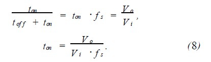 可以認為Δi就是電感線圈中的紋波電流,將導通和關斷狀態時的時間和電壓式(2)和式(3)代入上式,分別寫出導通狀態和關斷狀態時的紋波電流表達式: