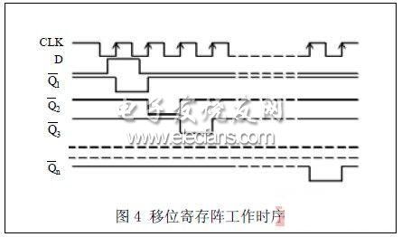 移位寄存陣是由D 觸發器串聯構成的,它與光電繼電器一起構成選通電路。圖3 中,D1,D2,……Dn 表示的是D 觸發器,每個D 觸發器的輸出Q 是下一個D 觸發器的數據信號,所有的D 觸發器由相同的時鐘信號控制。D 觸發器的反碼輸出Q 用來控制對應的光電繼電器的通斷,當Q 為高電平時光電繼電器斷開,當Q 為低電平時光電繼電器導通。通過控制第一個D 觸發器的數據信號,可實現D1,D2,……Dn 的Q 逐個輸出低電平即移位功能,從而控制光電繼電器K1,K2,……Kn按順序的逐個單獨閉合,實現通道選通功能。