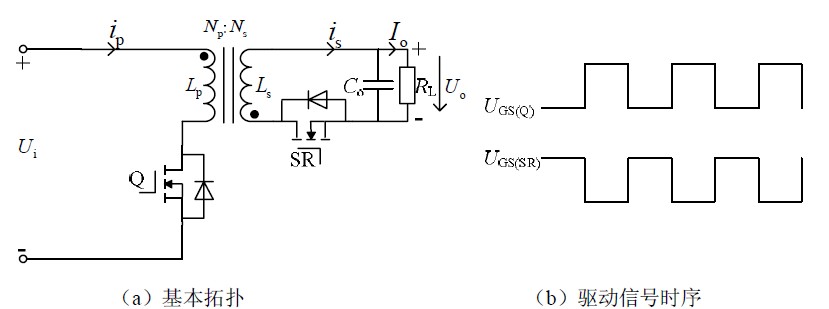 反激變換器次級的整流二極管用同步整流管SR 代替,構成同步整流反激變換器,基本拓撲如圖1(a)所示。為實現反激變換器的同步整流,初級MOS 管Q 和次級同步整流管SR 必須按順序工作,即兩管的導通時間不能重疊。當初級MOS 管Q 導通時,SR 關斷,變壓器存儲能量;當初級MOS 管Q 關斷時,SR 導通,變壓器將存儲的能量傳送到負載。驅動信號時序如圖1(b)所示。在實際電路中,為了避免初級MOS 管Q 和次級同步整流管SR 同時導通,Q 的關斷時刻和SR 導通時刻之間應有延遲;同樣Q 的導通時刻和SR 的關斷時刻之間也應該有延遲。