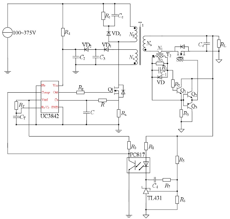 同步整流反激變換器的電路如圖3 所示,控制芯片選用UC3842。設計技術指標如下: