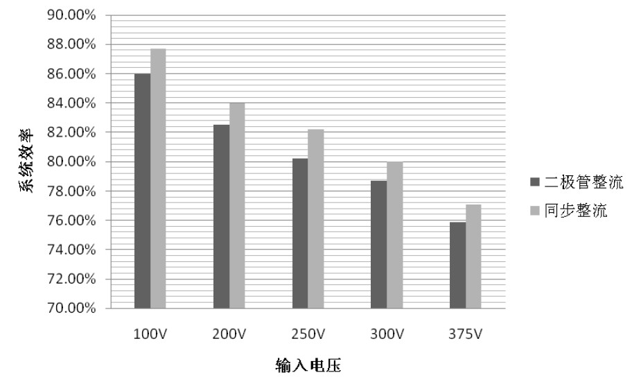 應用 Saber 仿真軟件對本文設計的同步整流反激變換器進行仿真。圖4 為輸入電壓200V,滿載時,初級MOS 管Q、次級同步整流管SR 驅動信號和次級電感電流波形。由圖可見,Q 關斷后,SR 經過很短的延遲后就開通,次級電感電流降至接近零時,SR 關斷。圖5 為輸入電壓100V、200V、250V、300V 和375V,滿載條件下,分別采用同步整流和二極管整流時,系統效率的分布圖。