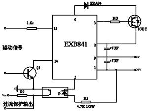 隨著IGBT在各類變流裝置中的廣泛應用,IGBT驅動模塊的選擇及其性能越來越引起使用者的重視。理想的驅動模塊除了應為IGBT提供足夠的開通和關斷柵壓外,還應具備迅速、可靠的保護功能,同時力求電路簡單、穩定。IGBT的常用驅動模塊有許多種,其中EXB系列應用最廣。EXB841驅動模塊廣泛應用于開關電源、UPS、電力傳動及電力補償等領域。圖4所示是本設的IGBT的驅動電路圖。