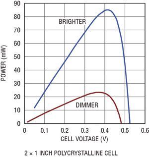 用光伏電池可產(chǎn)生多少功率取決于多種因素。電池的輸出功率與投射到電池上的光強(qiáng)度、電池的總面積以及電池的效率成正比。大多數(shù)光伏電池都規(guī)定在完全直射的太陽光 (1000W/m2) 下使用,但是在大多數(shù)應(yīng)用中,不可能有這么理想的條件。就依靠太陽光工作的設(shè)備來說,可從電池獲得的峰值功率可能非常容易變化,由于天氣、季節(jié)、煙霧、灰塵和太陽光入射角的變化,今天與明天相比有可能相差10倍。在充足的太陽光照下,晶體電池視電池特性的不同而有所不同,典型輸出功率約為每平方英寸40mW。面積為幾平方英寸的光伏電池足夠給多個(gè)遠(yuǎn)程傳感器供電以及給電池涓流充電了。