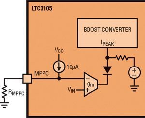 圖4顯示了LTC3105 使用的最大功率點(diǎn)控制機(jī)制的模型。圖3顯示了光伏電池的功率曲線。請注意,當(dāng)電池電壓上升而離開峰值功率點(diǎn)時(shí),光伏電池的功率就會從峰值點(diǎn)急劇下降。因此,一般更希望低于理想值而不是高于理想值的控制電壓,因?yàn)楣β是€在高壓端下降得更快。