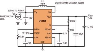 串聯(lián)連接的高壓光伏電池組能提供充足的功率,但單節(jié)光伏電池解決方案卻很少見,因?yàn)閱喂?jié)光伏電池在有負(fù)載情況下產(chǎn)生的電壓很低,從這么低的電壓難以產(chǎn)生有用的電源軌。幾乎沒有升壓型轉(zhuǎn)換器能從電壓很低、阻抗相對較高的單節(jié)光伏電池產(chǎn)生輸出。不過,LTC3105是專門為應(yīng)對這類挑戰(zhàn)而設(shè)計(jì)。該器件具有超低的250mV啟動電壓和可編程最大功率點(diǎn)控制,能從富有挑戰(zhàn)性的光伏電源產(chǎn)生大多數(shù)應(yīng)用所需的典型電壓軌(1.8~5V)。