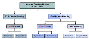 在ECS驅(qū)動饋電時,ECS決定了向電網(wǎng)傳輸?shù)墓β省H缃瘢瑔闻_RESs逆變器典型地就在這種饋電方式下運行,并向電網(wǎng)注入全部可提供的功率。在電網(wǎng)驅(qū)動饋電時,不再是ECS,而是電網(wǎng)決定功率的傳輸。典型的,大多數(shù)常規(guī)大型電廠運行在這種方式下,同樣,這種方式潛在的適合DERs和RESs系統(tǒng),或者至少適合混合式電力系統(tǒng)。在ECS驅(qū)動饋電的情況下,逆變器控制方式被稱作電網(wǎng)平行方式。第二種情況可以被兩種不同的逆變器控制方式實現(xiàn),分別是電網(wǎng)形成方式和電網(wǎng)支持方式。電網(wǎng)形成方式中逆變器的作用是建立和維持電網(wǎng)狀態(tài)變量。電網(wǎng)支持方式中逆變器被用于平衡功率。它可以傳輸預(yù)先設(shè)定數(shù)量的功率,這個數(shù)量可以根據(jù)電力系統(tǒng)的需要或者高級控制運行得到的參考值進行調(diào)整。應(yīng)用這個控制方式的逆變器例子如圖3至圖5的左側(cè)所示。此外,這些基本有功功率調(diào)控器潛在的對二次電網(wǎng)控制的相互聯(lián)系可以被類似的闡釋。