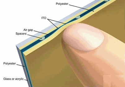 相反地,這種技術(shù)的主要缺點源于觸控屏幕的多層結(jié)構(gòu)。其基層一般是玻璃,表面涂有一層均勻的ITO,頂層通常由聚乙烯對苯二甲酸酯(PET)制造,內(nèi)表面(Inner Surface)也涂有一層均勻的ITO,而外表面(Outer Surface)則有硬涂層,以為保護作用,而形成空氣隙以把這些導(dǎo)電層隔離開的細小透明間隔點常在打印制程中產(chǎn)生。這種多層材料堆棧的多層結(jié)構(gòu)對透光性有所影響,一般將降至約透明玻璃透光率的75%,同時,空氣間隙可能產(chǎn)生薄霧效應(yīng),進一步降低清晰度。此外,這種結(jié)構(gòu)很容易刮傷損壞,而且因為機械軸性不重合,還須仔細校準以確定X、Y坐標范圍,其它弱點還包括可能吸收電氣噪聲,尤其是來自液晶顯示器(LCD),這時一般須進行濾波,將導(dǎo)致反應(yīng)時間的延長,當然,控制器一次只能處理一個觸摸位置,也是一大局限。
