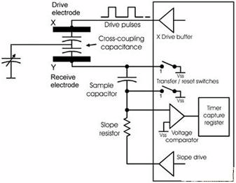 RC時間常數(shù)技術(shù)的基本原理是,當電容組件C隨手指觸摸改變時,電極區(qū)域充電或放電所需的時間也隨之改變。測量充/放電期間的變化可得到C的變化,因為C是未知,所以假設(shè)為Cx,這種方法有許多變化形式,可測量頻率或時間、可自由運行或以單周期為基礎(chǔ)。RC時間常數(shù)測量的缺點是速度較慢,并易受泄漏電流干擾,其動態(tài)范圍也非常有限,很難校準,而且容易受到恒定漂移問題的影響。此外,由于其電路的高阻抗特性,所以也極易受外界噪聲干擾,盡管如此,仍有部分觸控屏幕采用這種方案。