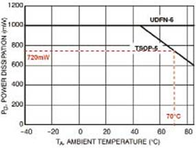 另一種評(píng)估封裝熱特性對(duì)應(yīng)用性能影響的方法是檢查功率下降曲線。圖2顯示了NCP1529的曲線,詳述了µDFN-6和TSOP-5封裝最大環(huán)境溫度閾值與功率耗散之間的關(guān)系。