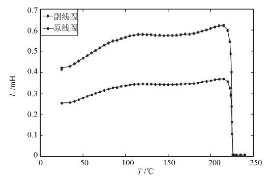 變壓器在中不僅能傳遞能量,同時還起到了電氣隔離的作用,變壓器的原邊與副邊線圈匝數比的不同可以達到升壓或降壓的作用。在模塊工作狀態下,由于磁芯的渦流效應,變壓器會產生很多的熱量,成為模塊熱量產生的主要來源。實驗中首先測試了變壓器原邊和副邊線圈的電感量隨溫度的變化,如圖3 所示,從圖3 中可見隨著溫度的升高,線圈的電感量先增加,然后小幅下降,再小幅上升,在環境溫度為220℃ 以前,變壓器的原邊與副本電感量的整體趨勢是逐漸增加,當溫度達到220℃,磁芯溫度達到居里點,線圈的電感量迅速降為零。對于不同磁芯材料的變壓器其居里點溫度有所不同,對于此類變壓器,可知居里溫度在220℃附近。當變壓器溫度接近居里點時,變壓器電感量會迅速減小,會導致輸出電壓迅速下降。