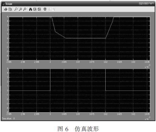 設觸發(fā)脈沖周期為2 ms,脈沖寬度為2μs,如圖6中的第一示波器(圖的下部),仿真線前端的波形如圖6中的第二示波器(圖的上部)。由第二示波器可見,當觸發(fā)脈沖到來時,即IGBT網絡導通時,仿真線迅速放電,放電速率為5 000 V/6μs(即從滿電壓5 000 V至放電完成時間約為6μs),并且無反沖。當觸發(fā)脈沖過去時,即IGBT網絡斷開時,仿真線迅速充電,放電速率為5 000 V/3μs(即從充電開始至滿電壓5 000 V的時間約為3μs),并且無反沖。