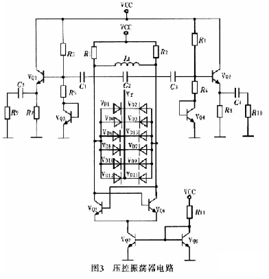 壓控振蕩器按構成原理可分為反饋型振蕩器和負阻型振蕩器2大類。這里采用負阻型振蕩器,其主要是由負阻器件和諧振回路組成的振蕩器,利用負阻器件的負電阻效應與諧振回路中的損耗正電阻相抵消,維持諧振回路的穩定振蕩。圖3為壓控振蕩器電路。