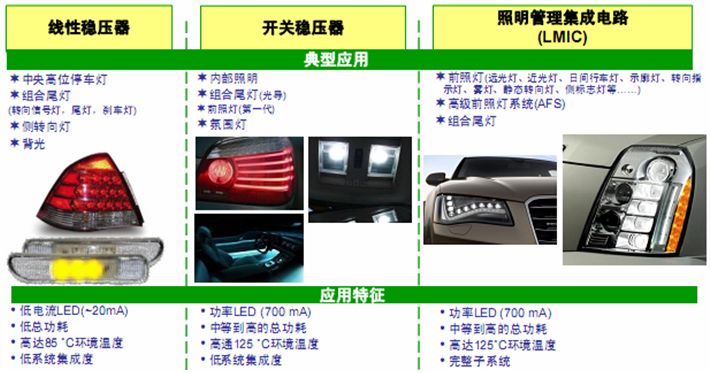 隨著LED性能不斷提升及成本不斷下降,在汽車內(nèi)部及外部照明中的應(yīng)用領(lǐng)域越來越寬。不同應(yīng)用對(duì)LED電流的要求又各不相同,故需要結(jié)合具體應(yīng)用要求,選擇適合的LED驅(qū)動(dòng)器方案,如線性恒流穩(wěn)流器、線性穩(wěn)壓器或開關(guān)穩(wěn)壓器等。本文介紹幾種應(yīng)用比較廣泛的LED驅(qū)動(dòng)器及具體方案,供設(shè)計(jì)人員在進(jìn)行汽車照明設(shè)計(jì)時(shí)參考。