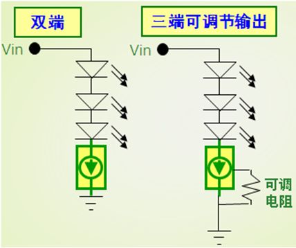 適合低電流LED應(yīng)用的CCR,可以采用安森美半導(dǎo)體運(yùn)用專利自偏置晶體管(SBT)技術(shù)開發(fā)出來得NSI45系列。這系列CCR包含雙端固定輸出和三端可調(diào)節(jié)輸出兩種類型,電流等級(jí)涵蓋10至180 mA,雙端及三端CCR電路圖如圖2所示。其中三端可調(diào)節(jié)輸出CCR包括電流30至80 mA(SOT-223)及60至150 mA(DPAK)等不同選擇,能夠用于滿足特定電流設(shè)置要求。