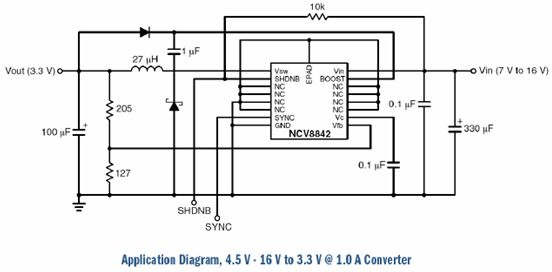 在降壓開關(guān)驅(qū)動(dòng)器方面,包括NCV8842、NCV8843及NCV51411等產(chǎn)品,適合于車身/遠(yuǎn)程信息系統(tǒng)等應(yīng)用。NCV8842/3是帶同步功能的1.5 A、170/340 kHz降壓驅(qū)動(dòng)器,支持4.5 V至40 V輸入電壓,而輸出電壓可從1.27 V開始編程設(shè)定。同步引腳功能用于改善EMI性能。