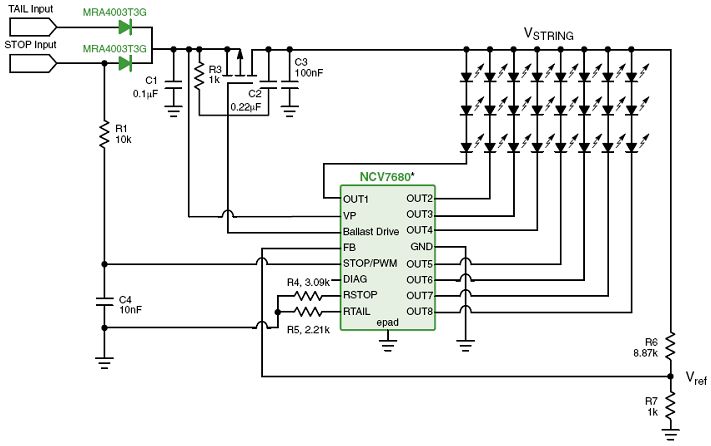 圖9: NCV7680在LED組合尾燈中的應(yīng)用電路圖