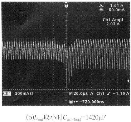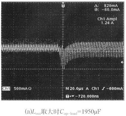 輸出電壓的穩(wěn)定過程中,一方面由輸出濾波電感的儲(chǔ)能來逐步補(bǔ)充,另一方面由反饋環(huán)控制電路原邊快速輸出更大功率。輸出電感的取值一般由電流紋波系數(shù)λ和電源的空載特性來確定,為了避免容性跳變輸出電壓過大的下沖,使控制電路達(dá)到極限,電感的取值要大于λ的理論值計(jì)算所得數(shù)值,但同時(shí)也要考慮輸出失載時(shí)的電壓上沖幅度,所以輸出電感也不能太大,大的電感一般不易制作、成本較高,所以電感的實(shí)際取值可以用實(shí)驗(yàn)的方法得到。圖4給出了輸出電感Lout不同取值時(shí),容性負(fù)載突變時(shí)輸出電感電流的跳變波形和最大的容性負(fù)載能力。
