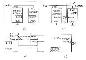 圖7 電源監視IC電路及時序圖 a.一般用法 b.具有雙向RESET引腳時的用法 c.時序圖 d.引腳圖