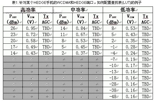 表1所示為針對某個HEDGE手機的WCDMA和HEDGE端口,如何配置查找表(LUT)的例子。該表格針對Avago的3G功率放大器,分為高、中和低功率模式三個主要部分。其它功率放大器因結構不同而具有不同的設置。高、中和低功率模式分區下各列內容為該模式下的輸出功率及其相應的VCON 電壓,這些電壓是基帶處理器生成的電壓,通知FAN5904為功率放大器提供正確的輸出電壓,獲得特定的輸出功率。GSM和EDGE則需要不同的查找表。