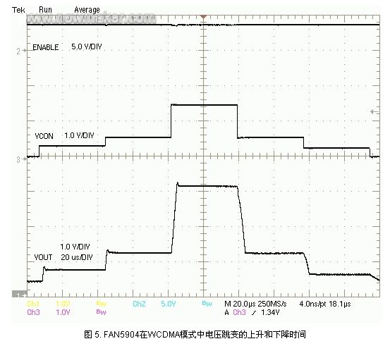 另一個常常被遺忘的參數是瞬態響應時間。當需要在不同電壓之間進行跳變,以便為功率放大器提供合適的輸出功率時,對各種無線協議而言,瞬態響應時間變得尤為重要。FAN5904以6MHz的頻率進行切換時,具有非常短的10?s響應時間 (如圖5所示),完全滿足時隙間隔為25?s的WCDMA規范和IOPC 6.4.2規范要求。
