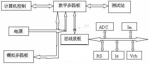 熱阻測試系統的基本構架是計算機通過軟件控制精密模擬和數字電路,實現對被測器件的條件施加→結果采樣→篩選→計算→比較→判別等一系列程序控制,完成對被測器件電參數的自動測試,每次測試的全過程小于0.2秒。系統主要有模擬多路板、數字多路板、ADC板、Im 板、Ie板和Vcb板組成,如圖1所示。