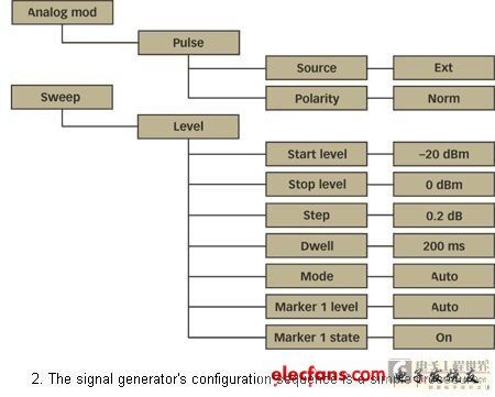 測試臺(圖1)使用一個與SMIQ RF信號發生器“脈沖”輸入相連接的脈沖發生器。為了在功率掃描模式中使用SMIQ,功率掃描必須與信號分析器中的時基掃描同步。幸好,當與二極管檢測器和類似XY模式濾波鏡的顯示器相關聯時,這一類信號發生器具有可以被用作純量網絡分析儀(SNA)的特性。在SMIQ的后部面板上,有幾個帶有功率掃描斜線以驅動濾波鏡的X軸的BNC連接器,以及校準顯示器X軸的標記。既然這樣,“標記”的輸出被當作信號分析器的觸發信號來使用。