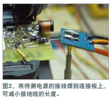 在測量電源軌的紋波時(shí),必須盡量減小噪聲,因?yàn)榧y波幅度可能很小。示波器探頭是基本的測量工具,但它們可能引入噪聲與誤差。地線(如與標(biāo)準(zhǔn)示波器探頭連接的那根線)可能增加一些不會出現(xiàn)在示波器軌跡上的電路噪聲。線路環(huán)就像一根天線,會提取周圍的雜散磁場。環(huán)路面積越大,提取的噪聲就越多。為證明這個(gè)理論,可將示波器地線連接到探頭尖端,然后到處移動。示波器會隨著地線的移動而顯示出噪聲的增減。用一個(gè)示波器探頭及其地線和插座可以做一個(gè)簡單的連接板(圖1)。