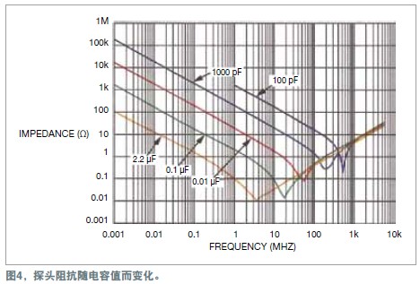電容應(yīng)采用多層堆疊式的瓷片電容,因?yàn)樗芨玫厝ヱ罡哳l噪聲。電解電容、紙電容以及塑料薄膜電容都有兩片金屬箔。金屬箔由一片電介質(zhì)分隔開,這三部分構(gòu)成一個(gè)卷狀物。這種結(jié)構(gòu)有自身的電感;因此,當(dāng)頻率高于數(shù)兆赫茲時(shí),它更類似于一只電感,而不是電容。圖4顯示了各種堆疊式瓷片電容值對電源的阻抗。