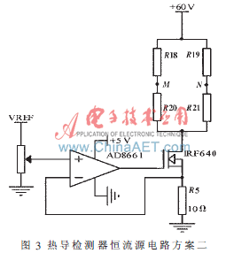 如果只是單純地將IRF640放在電橋的上方,而不加線性光耦HCNR201。如圖4所示,當(dāng)場效應(yīng)管IRF640截止,則M、N上的共模電壓為零,這樣雖然可以避免圖3方案的問題,但是當(dāng)橋流較大時(shí)(200 mA,橋電阻為100Ω),則場效應(yīng)管IRF640的柵極電壓達(dá)到20多伏,超過了AD8661的電源電壓范圍(±18 V)。因此圖3、圖4方案都不可行。