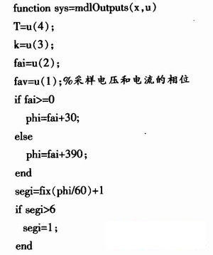 盡管現有的DSP技術和FPGA技術處理速度很快,很有效,但矩陣變換器的控制仍非常復雜,在仿真中,若按傳統方法使用定義好的Simulink模塊,會非常繁瑣,因為必須正確的設置大量的參數,而又沒有合適的調試工具。通過Matlab/Simulink里的功能強大的S函數,S函數完美地結合了Simulink框圖簡潔明快的特點和Matlab編程靈活方便的優點,可充分利用Matlab提供的豐富資源,調用各種工具箱函數,實現模塊所無法實現的復雜功能,從而使問題大大簡化。編程中既可以使用C語言,也可以使用Matlab語言來實現空間矢量調制法。使用后者會更簡單些,以下是部分程序: