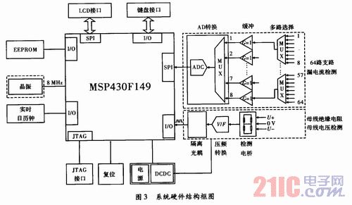 直流接地檢測(cè)系統(tǒng)采用低功耗處理器MSP430F149為硬件核心,外圍電路可分為數(shù)據(jù)采集模塊、人機(jī)交互模塊、處理器模塊。數(shù)據(jù)采集模塊負(fù)責(zé)檢測(cè)64路支路的漏電流、母線電壓、母線絕緣電阻;人機(jī)交互模塊負(fù)責(zé)進(jìn)行液晶顯示和鍵盤輸入;處理器模塊負(fù)責(zé)協(xié)調(diào)整個(gè)系統(tǒng)的數(shù)據(jù)處理,數(shù)據(jù)存儲(chǔ),人機(jī)交互等。具體的硬件結(jié)構(gòu)框圖,如圖3所示。