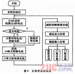 整個(gè)程序的編寫均由C語言完成,在程序設(shè)計(jì)中,采用了結(jié)構(gòu)化程序設(shè)計(jì)方法,使各個(gè)模塊程序相對(duì)獨(dú)立,便于程序代碼的維護(hù)、移植和升級(jí)。同時(shí),這樣分離式的程序設(shè)計(jì),降低了代碼的調(diào)試難度,縮短了調(diào)試周期。將與接地故障信息(如母線電壓,母線絕緣電阻,支路絕緣電阻,接地支路號(hào)等)密切相關(guān)的數(shù)據(jù)放在一個(gè)結(jié)構(gòu)體里,便于掉電存儲(chǔ)與回放顯示。系統(tǒng)的主程序流程圖,如圖4所示。