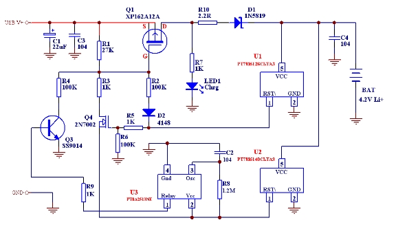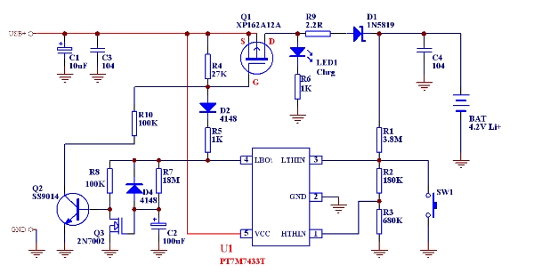 PT7M7433T是上海百利通公司最新設(shè)計(jì)的極高精度的一系列電壓檢測器的其中一款,其檢測精度在0-Vcc (5.5V)范圍內(nèi)小于1mV,而且其批量IC的檢測值偏差<±2.5%,這樣完全保證了批量產(chǎn)品的性能一致性和極高的總體性能,我們利用其配合少量外部電路即可組成相當(dāng)簡單的鋰電池充電線路。