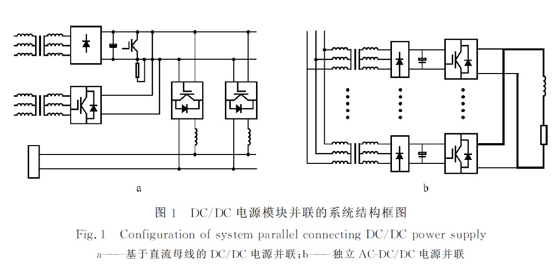 采用圖1a所示的拓?fù)浣Y(jié)構(gòu),系統(tǒng)需大容量不可調(diào)直流電源,一般可采用整流變壓器降壓,二極管整流并經(jīng)電容濾波得到。這種結(jié)構(gòu)雖可保證并聯(lián)的每條支路有共同的直流電壓輸入,避免并聯(lián)支路因直流側(cè)輸入電壓不同而帶來(lái)的不均衡,但該直流電源的容量大,電流達(dá)20KA,直流母線承受的負(fù)荷過(guò)重,前級(jí)AC-DC設(shè)備要求較高,不易實(shí)現(xiàn)。另外,輸入端共用母線不利于實(shí)現(xiàn)完全意義上的獨(dú)立電源模塊的并聯(lián)。因此,采用如圖1b所示的AC-DC/DC直流電源并聯(lián)的拓?fù)浣Y(jié)構(gòu)。