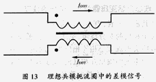 差模電流以相反的方向流過共模扼流圈的繞阻,建立大小相等,極性相反的磁場,它能使輸出相互抵消,見圖13。這就使共模扼流圈對(duì)差模信號(hào)的阻抗為零。差模信號(hào)能不受阻地通過共模扼流圈。
