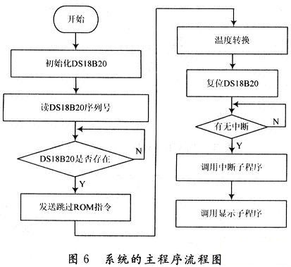 蓄電池溫度監測系統的軟件設計主要包括主程序、外部中斷子程序、顯示子程序等。圖6是該系統的主程序流程圖。用于完成對DS18B20的調用、中斷管理、測量溫度值的計算及溫度值的顯示等功能。主機89S51首先復位脈沖使信號線上所有的DS18B20芯片都被復位,接著發送跳過ROM操作命令,激活在線的所有DS18B20,然后系統轉人中斷處理流程,完成溫度轉換,讀取等工作。外部中斷子程序完成對溫度測量數據的讀取,顯示子程序完成液晶顯示器的初始化及顯示溫度值。